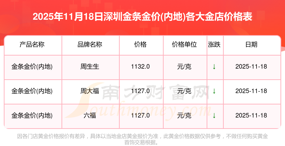 2025年11月18日深圳周大福、周大福、周大福、周大福、周大福、周大福、周大福、老凤祥、老凤祥、老凤祥、周六福等各大金店品牌金条金价(内地)最新价格如下:周大福黄金价格1288.0元/克,周大福铂金价格626.0元/克,周大福饰品金价(内地)1288.0元/克,周大福黄金饰品(香港)44770.0,周大福铂金价格(香港)17820.0,周大福金条价格(香港)40390.0,周大福金条金价(内地)1127.0元/克,老凤祥黄金价格1285.0元/克,老凤祥铂金价格600.0元/克,老凤祥足金价格1285.0元/克,周六福黄金价格1257.0元/克。