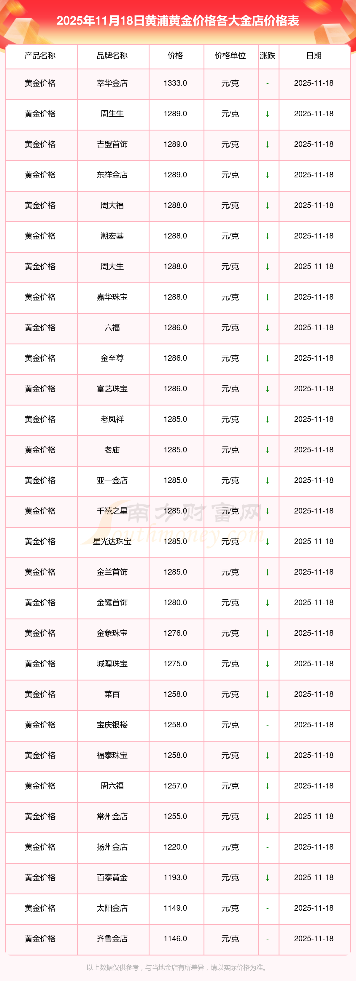 今天是2025年11月18日,黄浦周大福、周大福、周大福、周大福、周大福、周大福、周大福、老凤祥、老凤祥、老凤祥、周六福等各大金店品牌黄金价格最新价格行情是这样的:周大福1288.0元/克、周大福626.0元/克、周大福1288.0元/克、周大福44770.0、周大福17820.0、周大福40390.0、周大福1127.0元/克、老凤祥1285.0元/克、老凤祥600.0元/克、老凤祥1285.0元/克、周六福1257.0元/克。