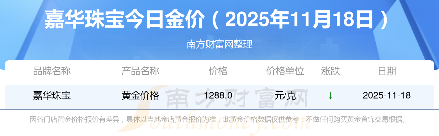 2025年11月18日嘉华珠宝金价查询:黄金价格1288.0元/克,铂金价格626.0元/克,饰品金价(内地)1288.0元/克,黄金饰品(香港)44770.0,铂金价格(香港)17820.0,金条价格(香港)40390.0,金条金价(内地)1127.0元/克,黄金价格1285.0元/克,铂金价格600.0元/克,足金价格1285.0元/克,黄金价格1257.0元/克。