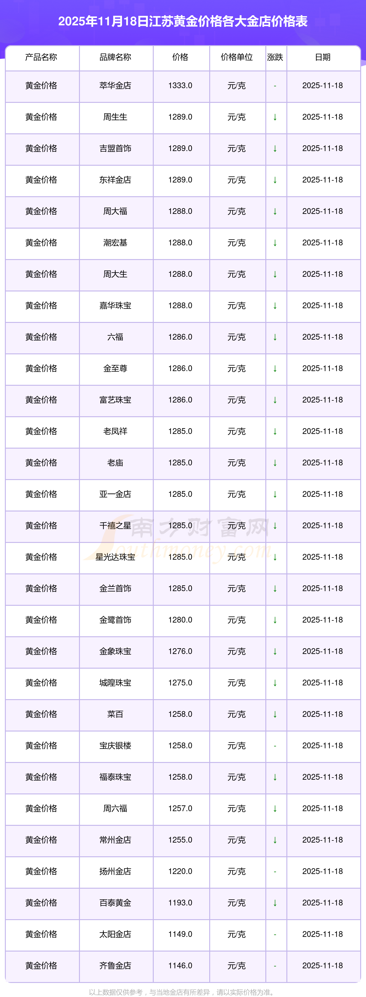 2025年11月18日,江苏周大福、周大福、周大福、周大福、周大福、周大福、周大福、老凤祥、老凤祥、老凤祥、周六福等各大金店品牌黄金价格今日价格如下:周大福1288.0元/克、周大福626.0元/克、周大福1288.0元/克、周大福44770.0、周大福17820.0、周大福40390.0、周大福1127.0元/克、老凤祥1285.0元/克、老凤祥600.0元/克、老凤祥1285.0元/克、周六福1257.0元/克。