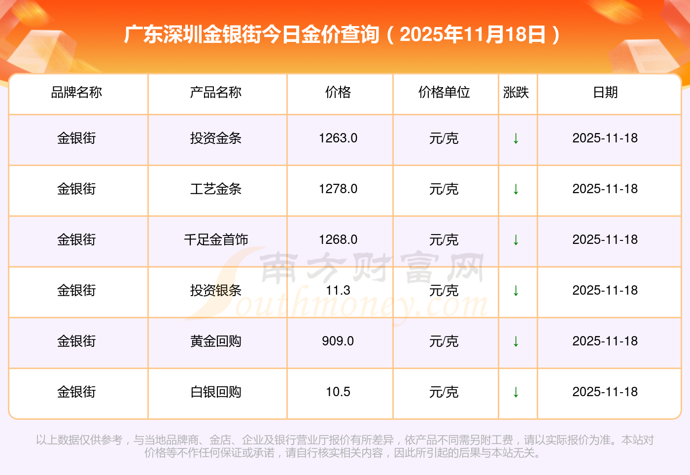 以上数据仅供参考,与当地品牌商、金店、企业及银行营业厅报价有所差异,依产品不同需另附工费,请以实际报价为准。本站对价格等不作任何保证或承诺,请自行核实相关内容,因此所引起的后果与本站无关。
