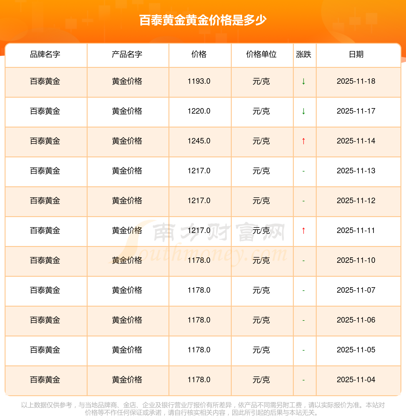 以上数据仅供参考,与当地金店有所差异,请以实际价格为准。