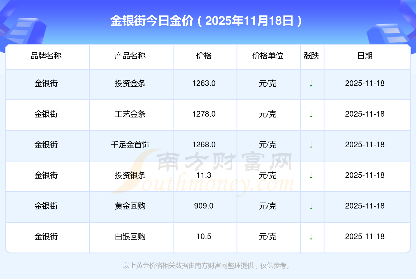 2025年11月18日金银街最新价格:黄金价格1288.0元/克,铂金价格626.0元/克,饰品金价(内地)1288.0元/克,黄金饰品(香港)44770.0,铂金价格(香港)17820.0,金条价格(香港)40390.0,金条金价(内地)1127.0元/克,黄金价格1285.0元/克,铂金价格600.0元/克,足金价格1285.0元/克,黄金价格1257.0元/克。