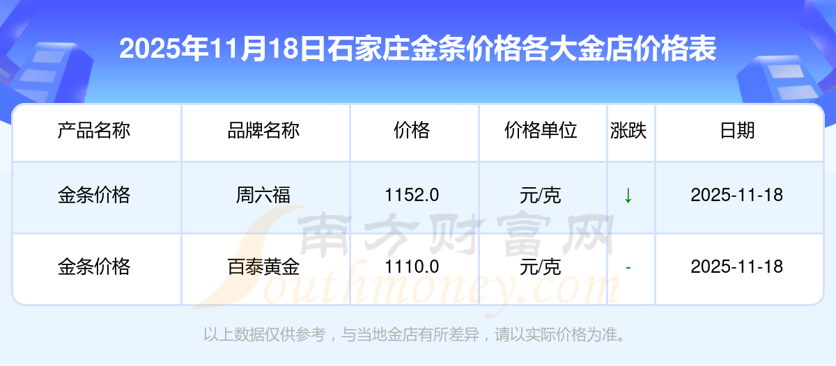 石家庄金条价格最高的金店是周六福,报价1152.0元/克,最低的是百泰黄金,报价1110.0元/克。今日金条价格高低差为42元/克。