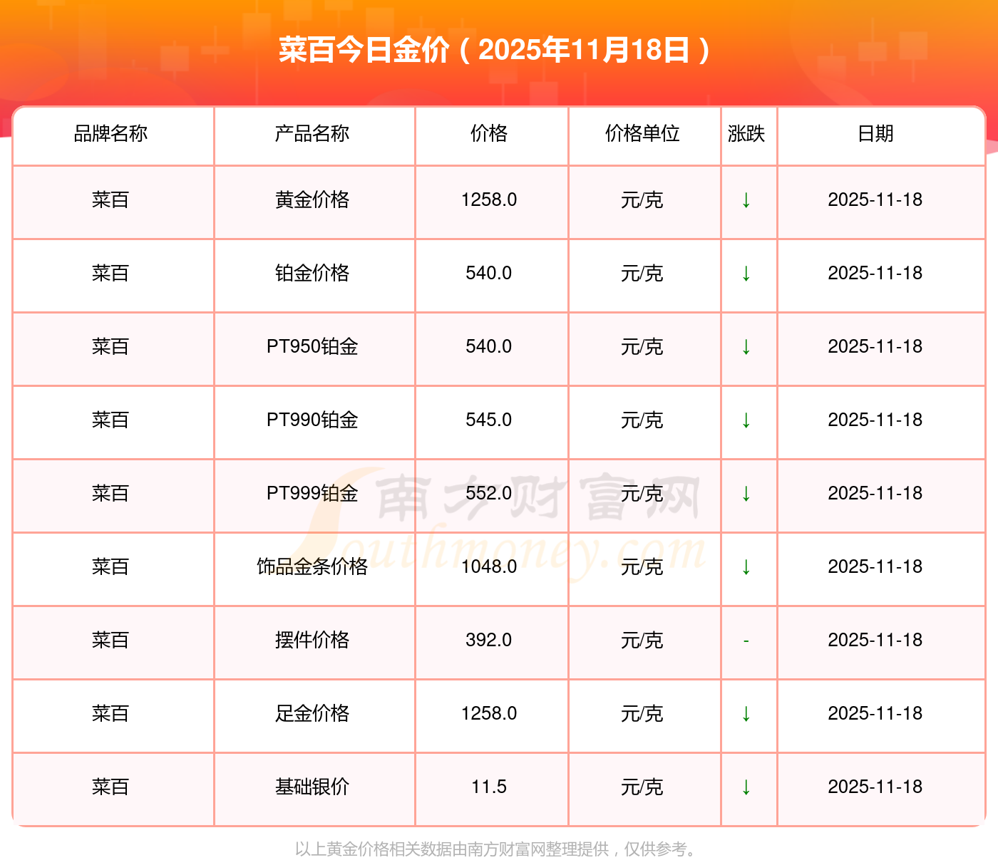 以上数据仅供参考,与当地品牌商、金店、企业及银行营业厅报价有所差异,依产品不同需另附工费,请以实际报价为准。本站对价格等不作任何保证或承诺,请自行核实相关内容,因此所引起的后果与本站无关。