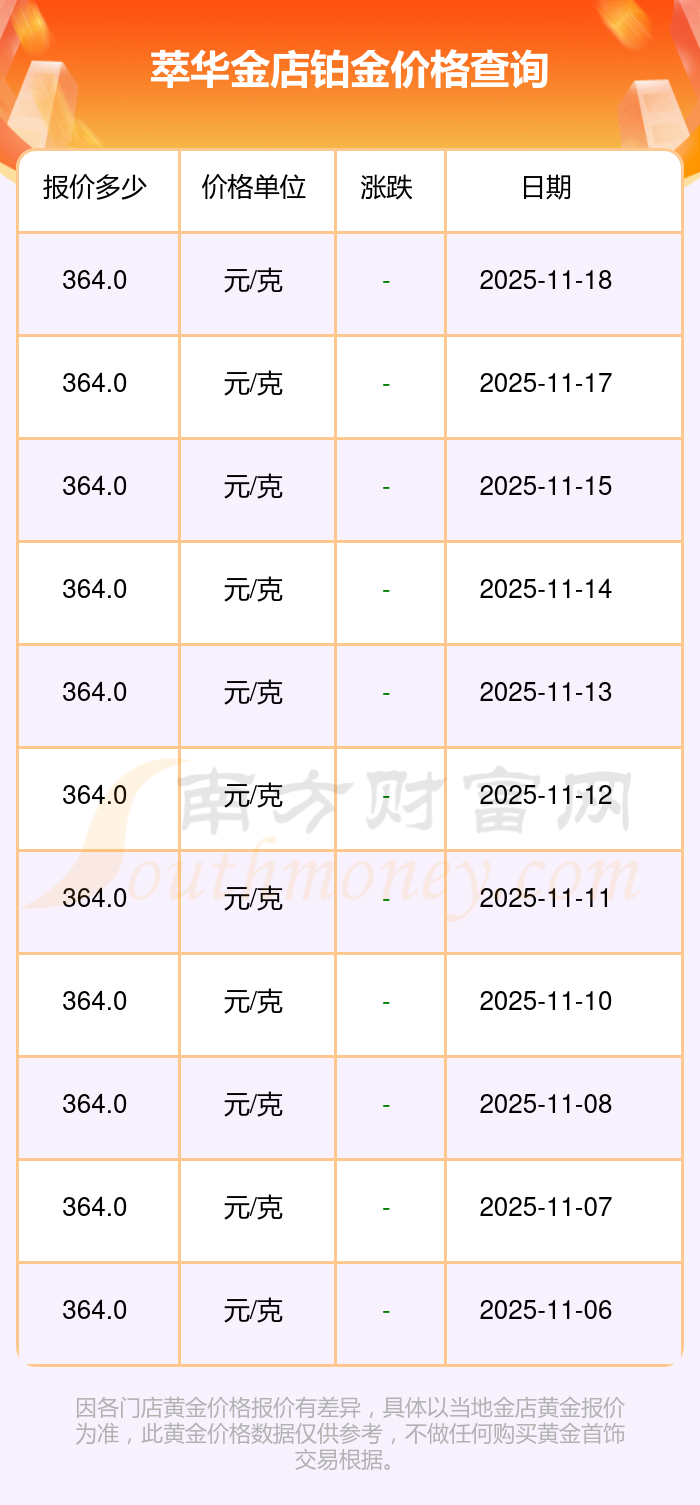 364.0元/克成为萃华金店今日 铂金价格的最新交易的价格。
