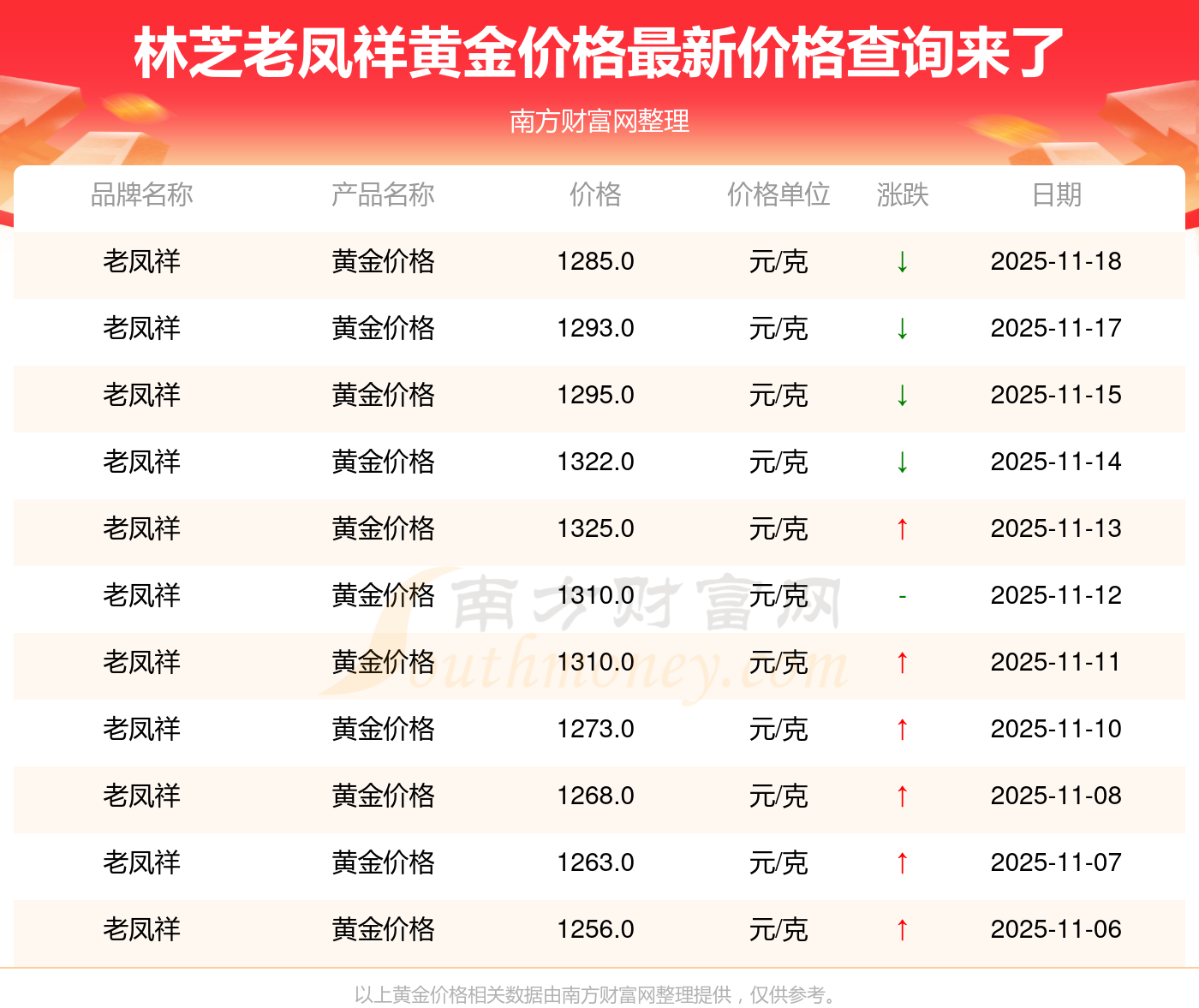 以上数据仅供参考,与当地金店有所差异,请以实际价格为准。