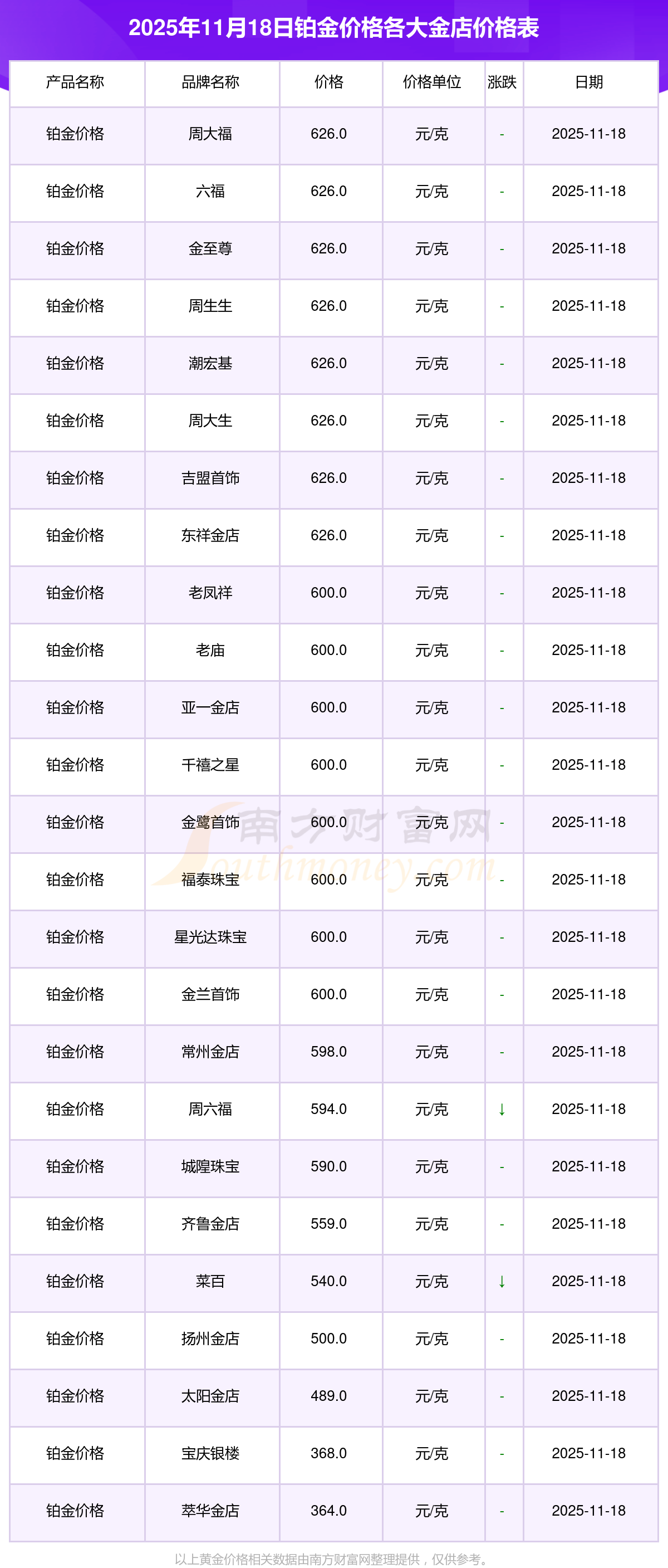 今天是2025年11月18日,周大福、周大福、周大福、周大福、周大福、周大福、周大福、老凤祥、老凤祥、老凤祥、周六福等各大金店品牌铂金价格最新价格如下:周大福1288.0元/克、周大福626.0元/克、周大福1288.0元/克、周大福44770.0、周大福17820.0、周大福40390.0、周大福1127.0元/克、老凤祥1285.0元/克、老凤祥600.0元/克、老凤祥1285.0元/克、周六福1257.0元/克。