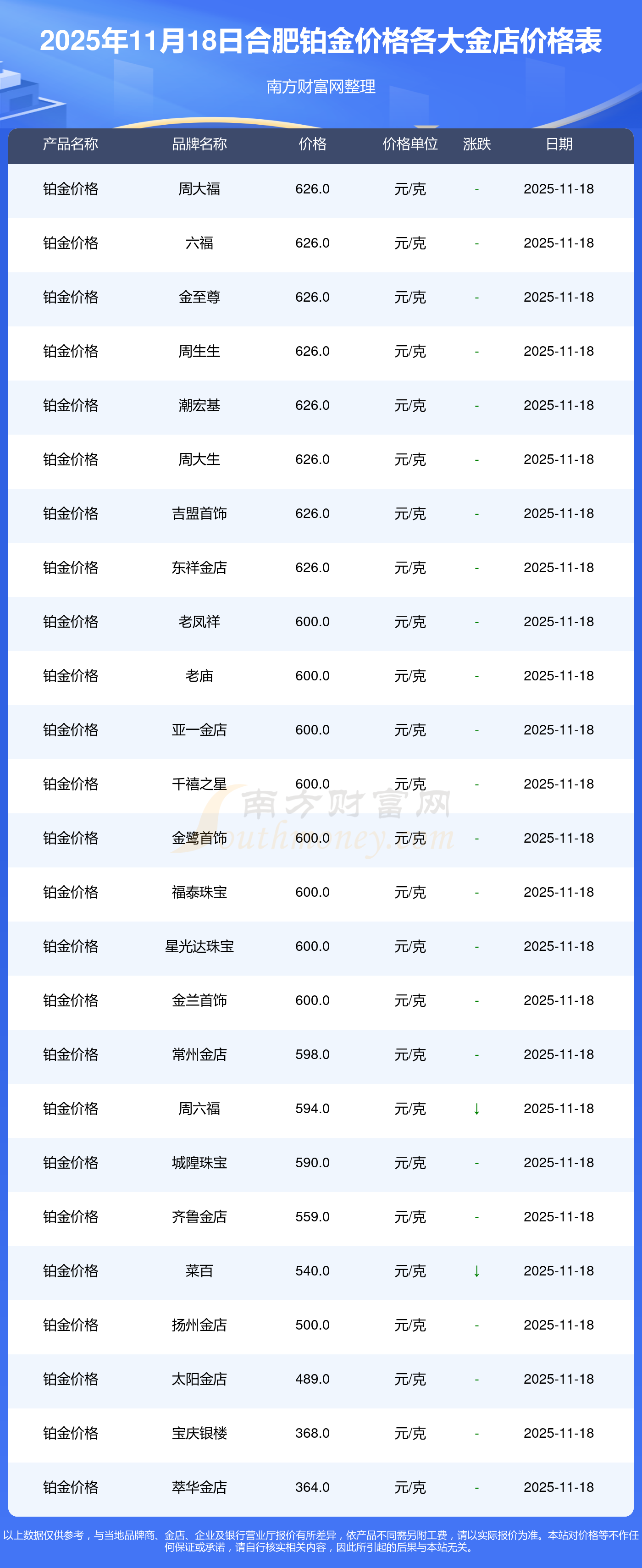 今天是2025年11月18日,合肥周大福、周大福、周大福、周大福、周大福、周大福、周大福、老凤祥、老凤祥、老凤祥、周六福等各大金店品牌铂金价格最新价格如下:周大福1288.0元/克、周大福626.0元/克、周大福1288.0元/克、周大福44770.0、周大福17820.0、周大福40390.0、周大福1127.0元/克、老凤祥1285.0元/克、老凤祥600.0元/克、老凤祥1285.0元/克、周六福1257.0元/克。