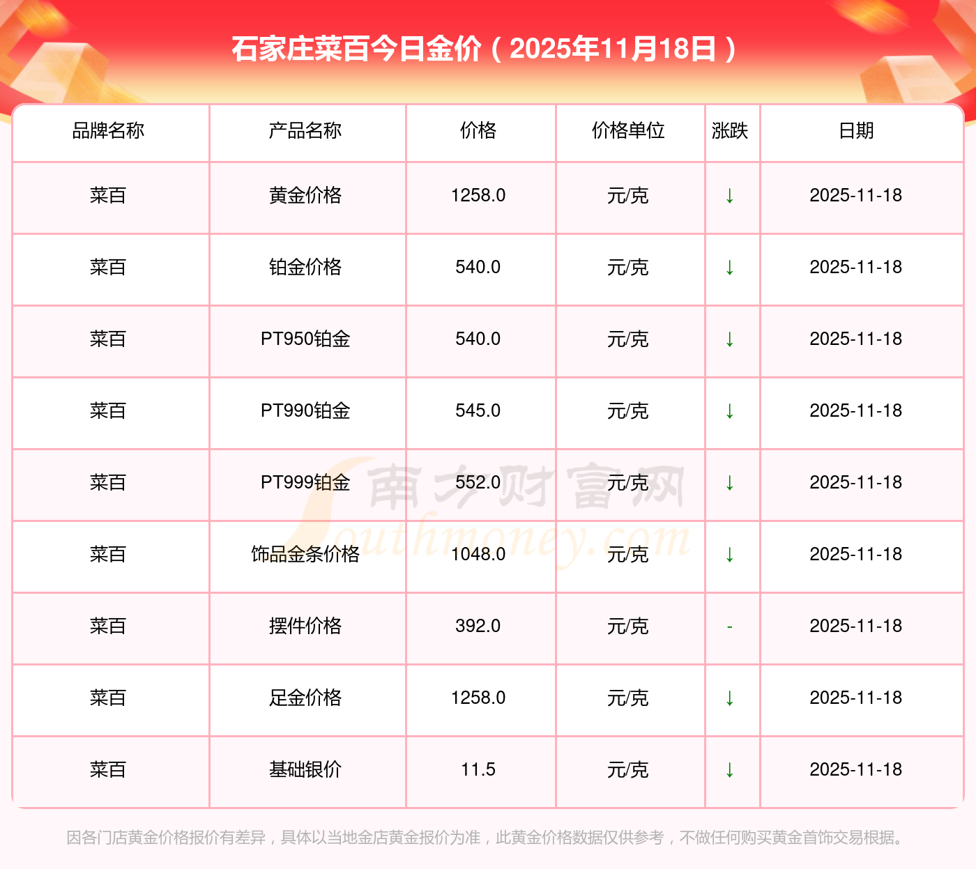今天黄金价位怎样?当下一克黄金的价格为多少?2025年11月18日石家庄菜百金价查询:黄金价格1288.0元/克,铂金价格626.0元/克,饰品金价(内地)1288.0元/克,黄金饰品(香港)44770.0,铂金价格(香港)17820.0,金条价格(香港)40390.0,金条金价(内地)1127.0元/克,黄金价格1285.0元/克,铂金价格600.0元/克,足金价格1285.0元/克,黄金价格1257.0元/克。