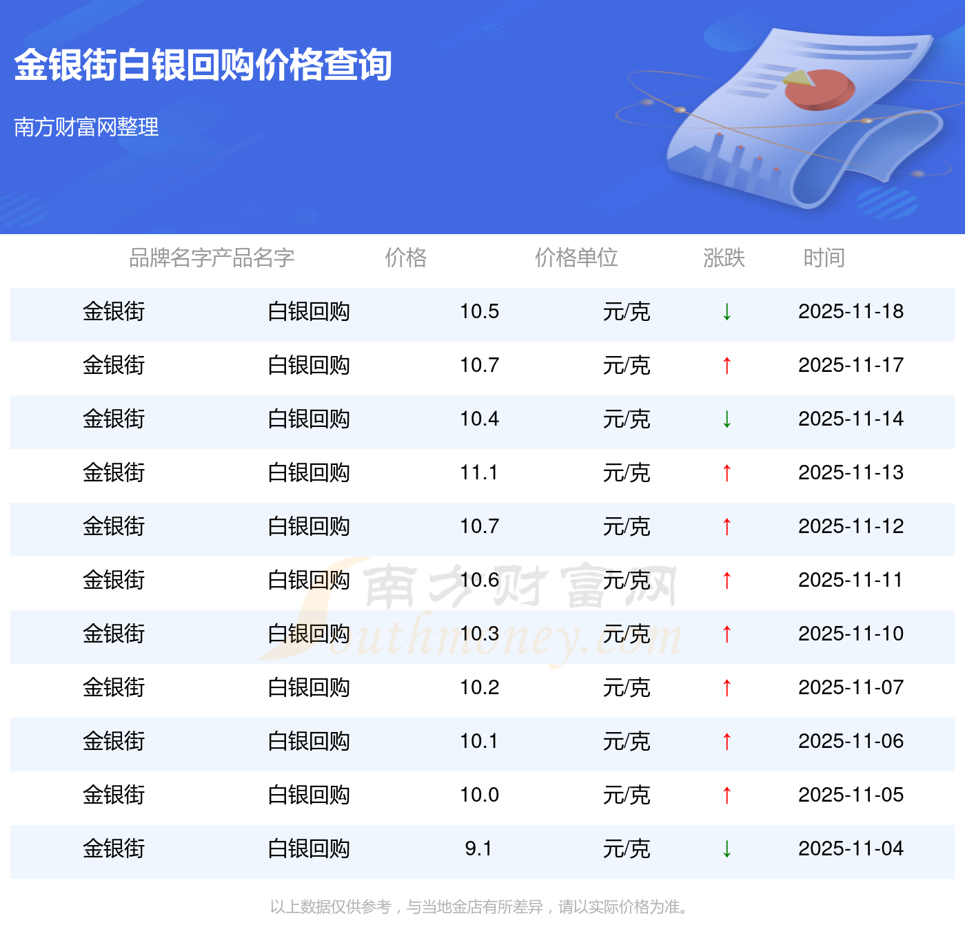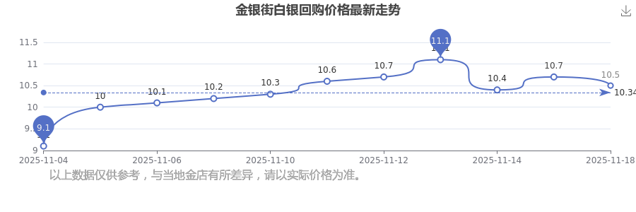 金银街今日白银回购的最新市场行情价为10.5元/克。