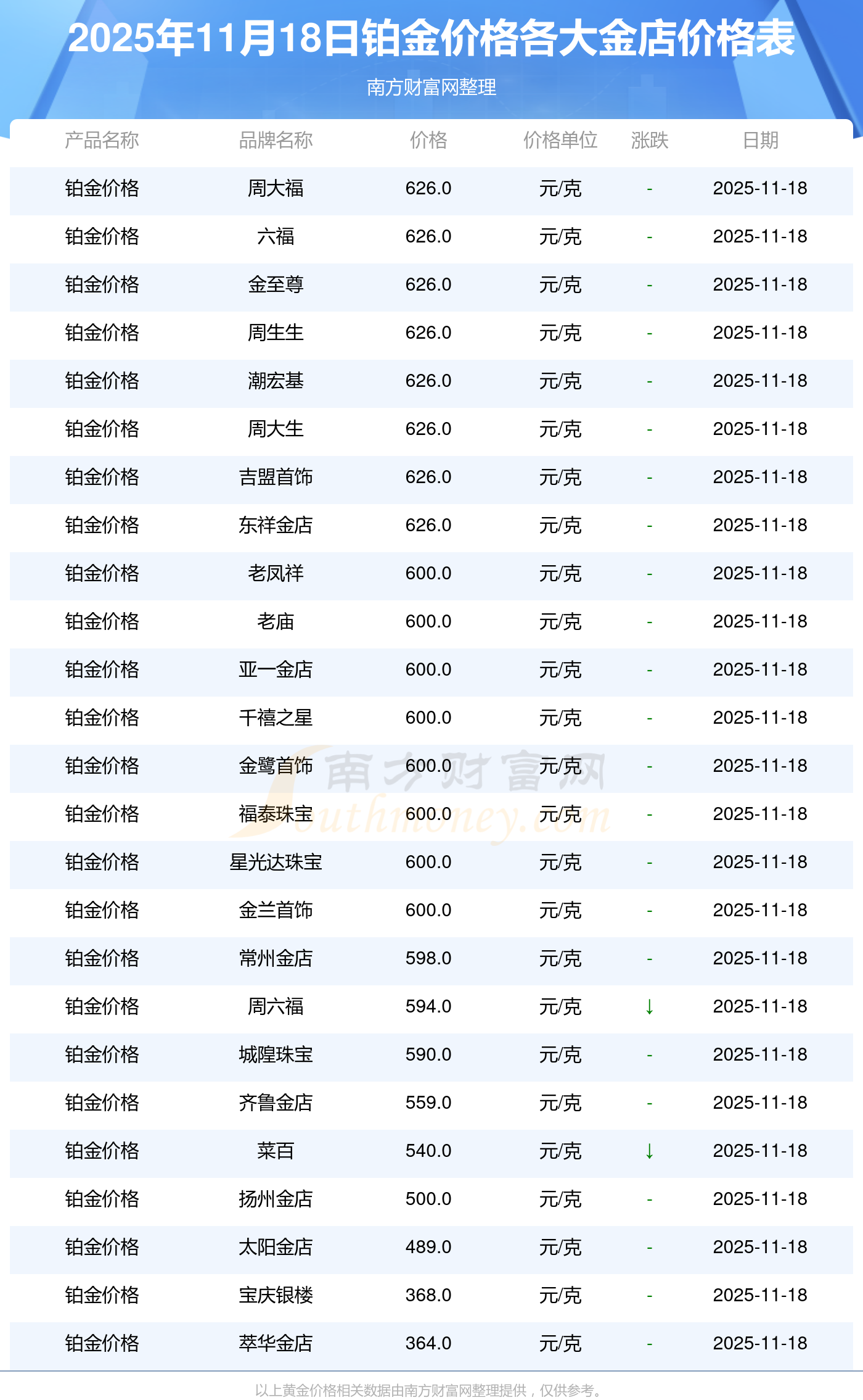 今天是2025年11月18日,周大福、周大福、周大福、周大福、周大福、周大福、周大福、老凤祥、老凤祥、老凤祥、周六福等各大金店品牌铂金价格最新价格如下:周大福1288.0元/克、周大福626.0元/克、周大福1288.0元/克、周大福44770.0、周大福17820.0、周大福40390.0、周大福1127.0元/克、老凤祥1285.0元/克、老凤祥600.0元/克、老凤祥1285.0元/克、周六福1257.0元/克。