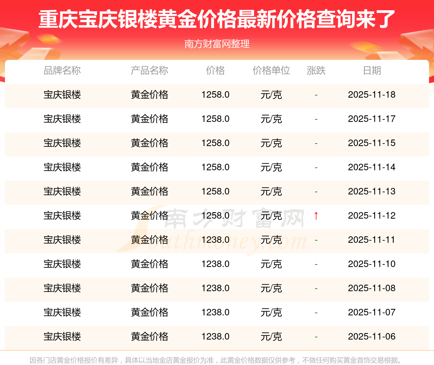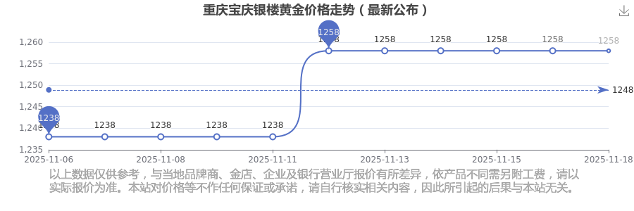 今日(2025年11月18日)重庆宝庆银楼黄金价格:1258.0元/克。