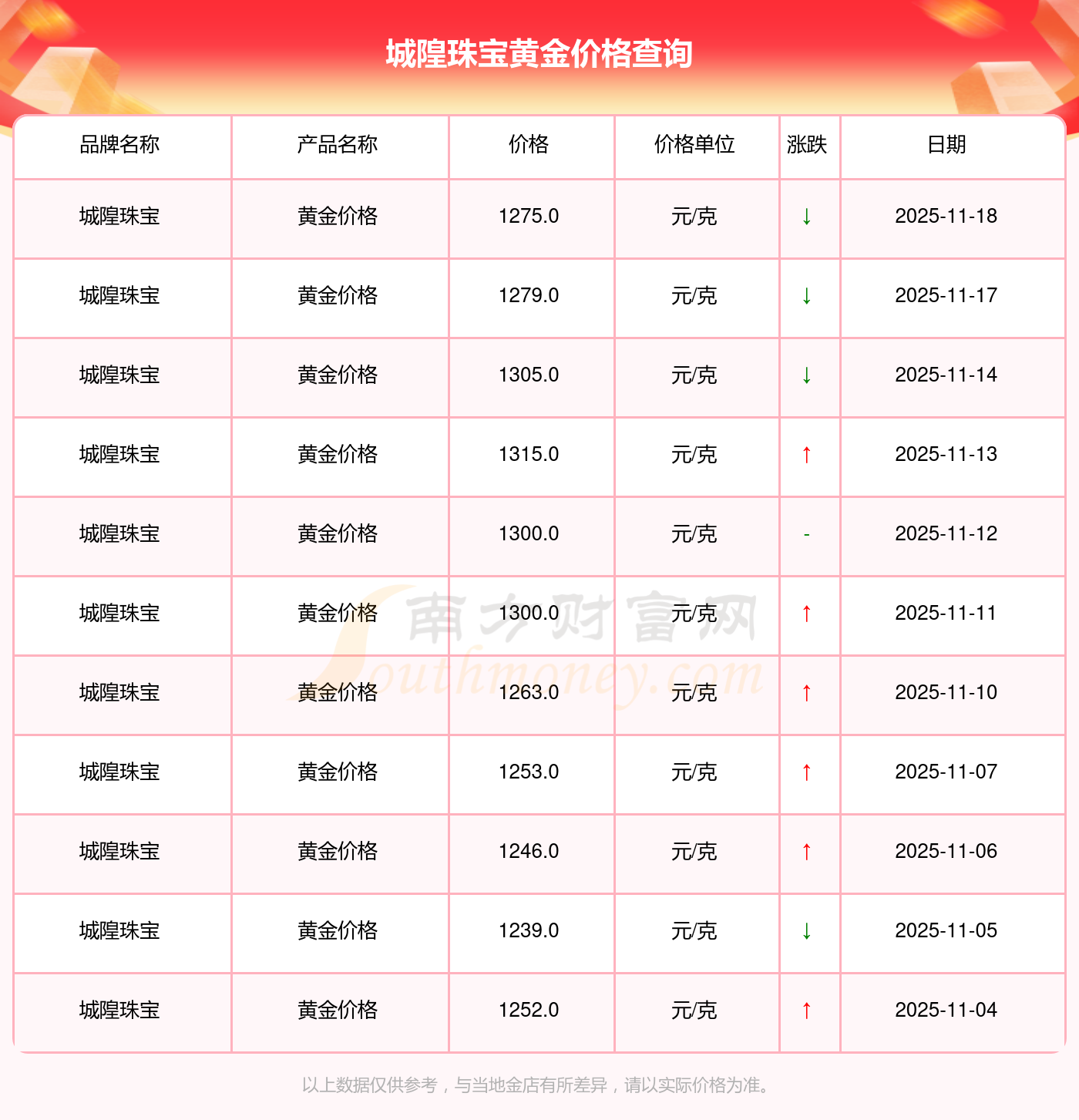 想了解今日黄金价格,现在每克黄金的价格是多少呢?一克黄金的价格会是多少呢?2025年11月18日城隍珠宝黄金价格是1275.0元/克。