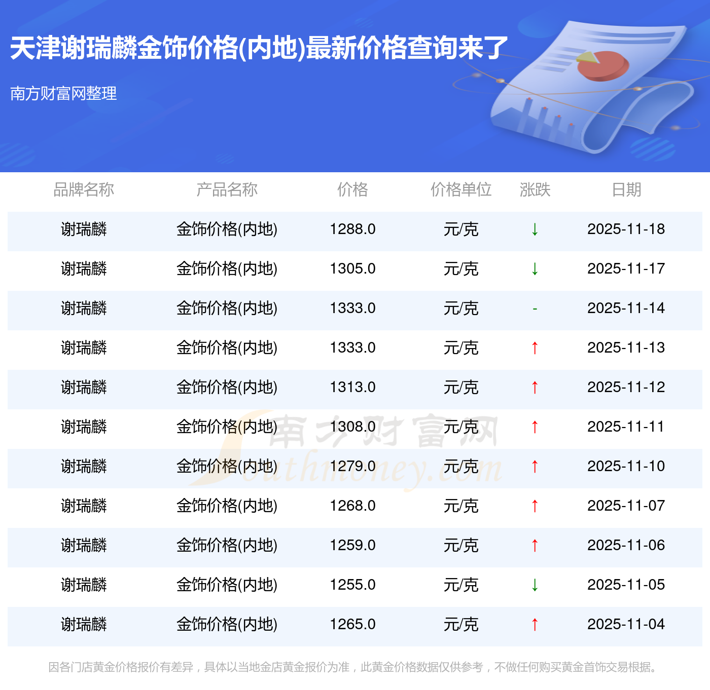 于 2025年11月18日,天津谢瑞麟金饰价格(内地)的克价为1288.0元/克。