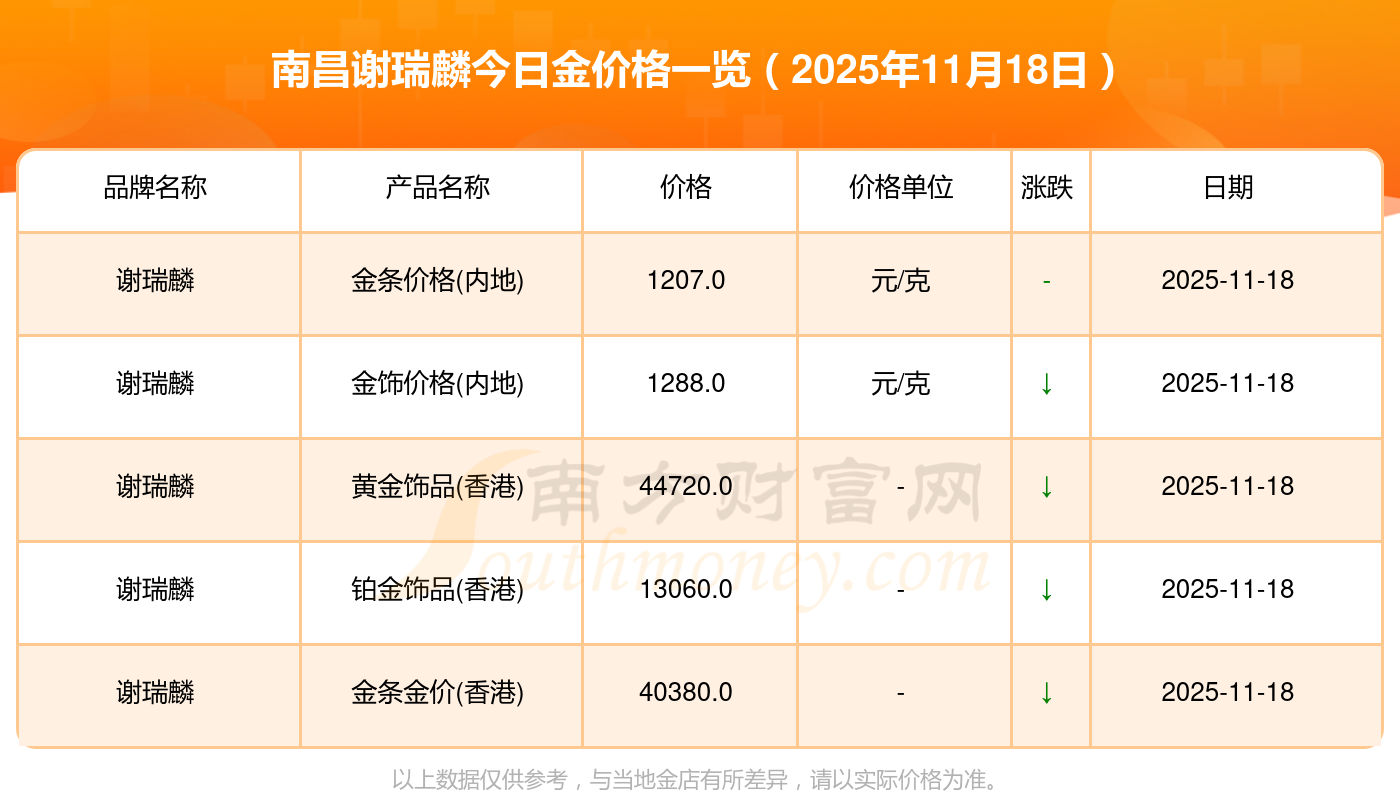 2025年11月18日南昌谢瑞麟现在黄金一克要多少钱:黄金价格1288.0元/克,铂金价格626.0元/克,饰品金价(内地)1288.0元/克,黄金饰品(香港)44770.0,铂金价格(香港)17820.0,金条价格(香港)40390.0,金条金价(内地)1127.0元/克,黄金价格1285.0元/克,铂金价格600.0元/克,足金价格1285.0元/克,黄金价格1257.0元/克。
