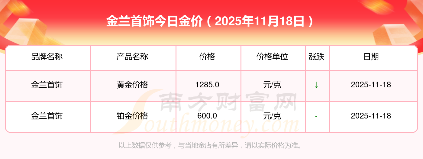 2025年11月18日各大金店黄金价格最新价格:周大福1288.0元/克,周大福626.0元/克,周大福1288.0元/克,周大福44770.0,周大福17820.0,周大福40390.0,周大福1127.0元/克,老凤祥1285.0元/克,老凤祥600.0元/克,老凤祥1285.0元/克,周六福1257.0元/克。