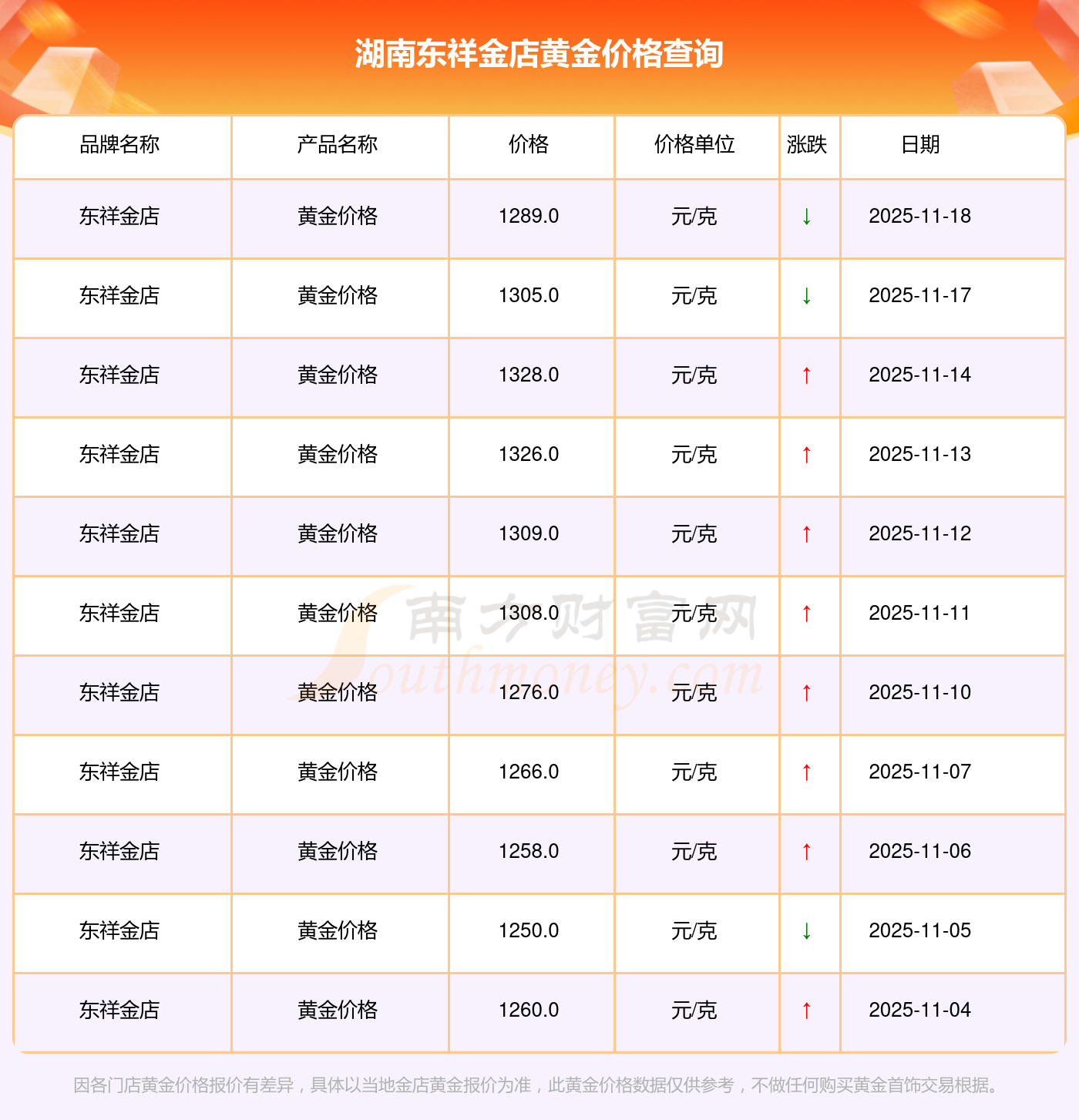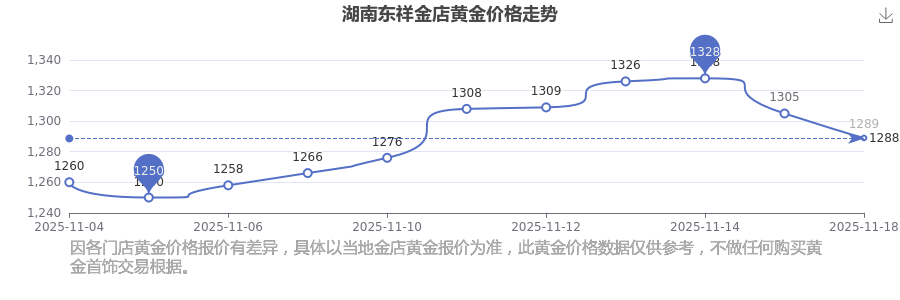 2025年11月18日,今日湖南东祥金店黄金价格:1289.0元/克。