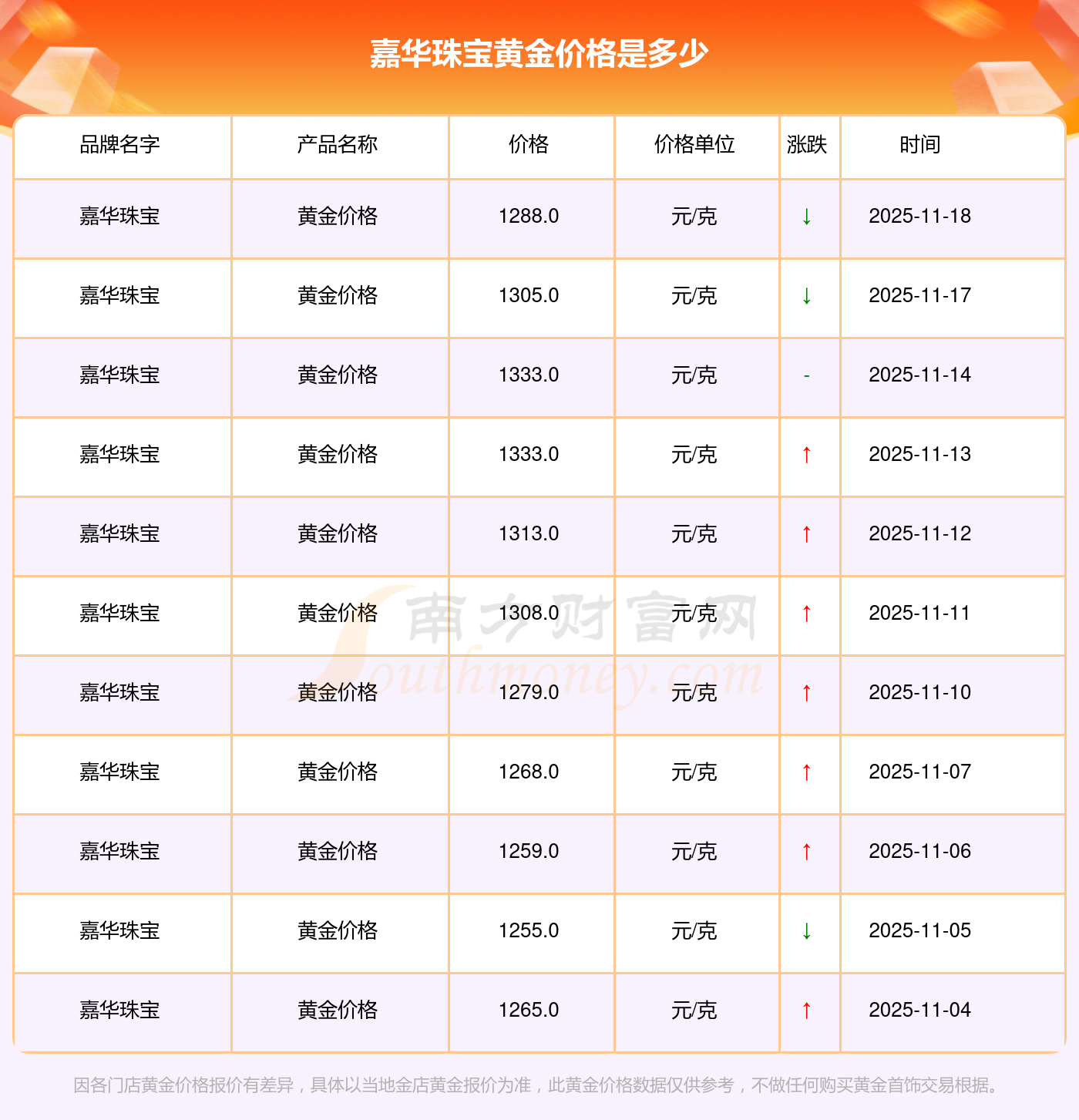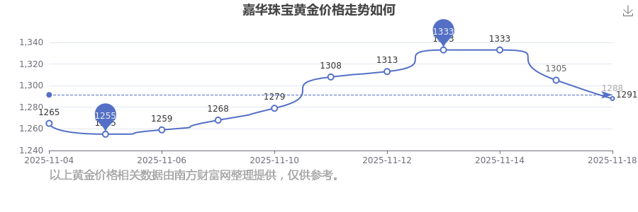 今天黄金价位怎样?当下一克黄金的价格为多少?黄金每克的价格通常在什么范围呢?今日嘉华珠宝黄金价格为1288.0元/克。