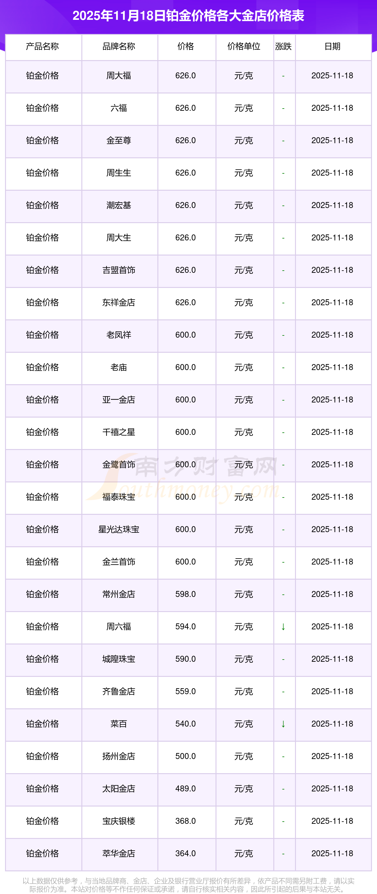 2025年11月18日,周大福、周大福、周大福、周大福、周大福、周大福、周大福、老凤祥、老凤祥、老凤祥、周六福等各大金店品牌铂金价格今日价格如下:周大福1288.0元/克、周大福626.0元/克、周大福1288.0元/克、周大福44770.0、周大福17820.0、周大福40390.0、周大福1127.0元/克、老凤祥1285.0元/克、老凤祥600.0元/克、老凤祥1285.0元/克、周六福1257.0元/克。