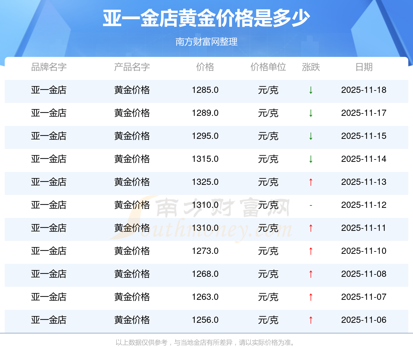 以上数据仅供参考,与当地品牌商、金店、企业及银行营业厅报价有所差异,依产品不同需另附工费,请以实际报价为准。本站对价格等不作任何保证或承诺,请自行核实相关内容,因此所引起的后果与本站无关。