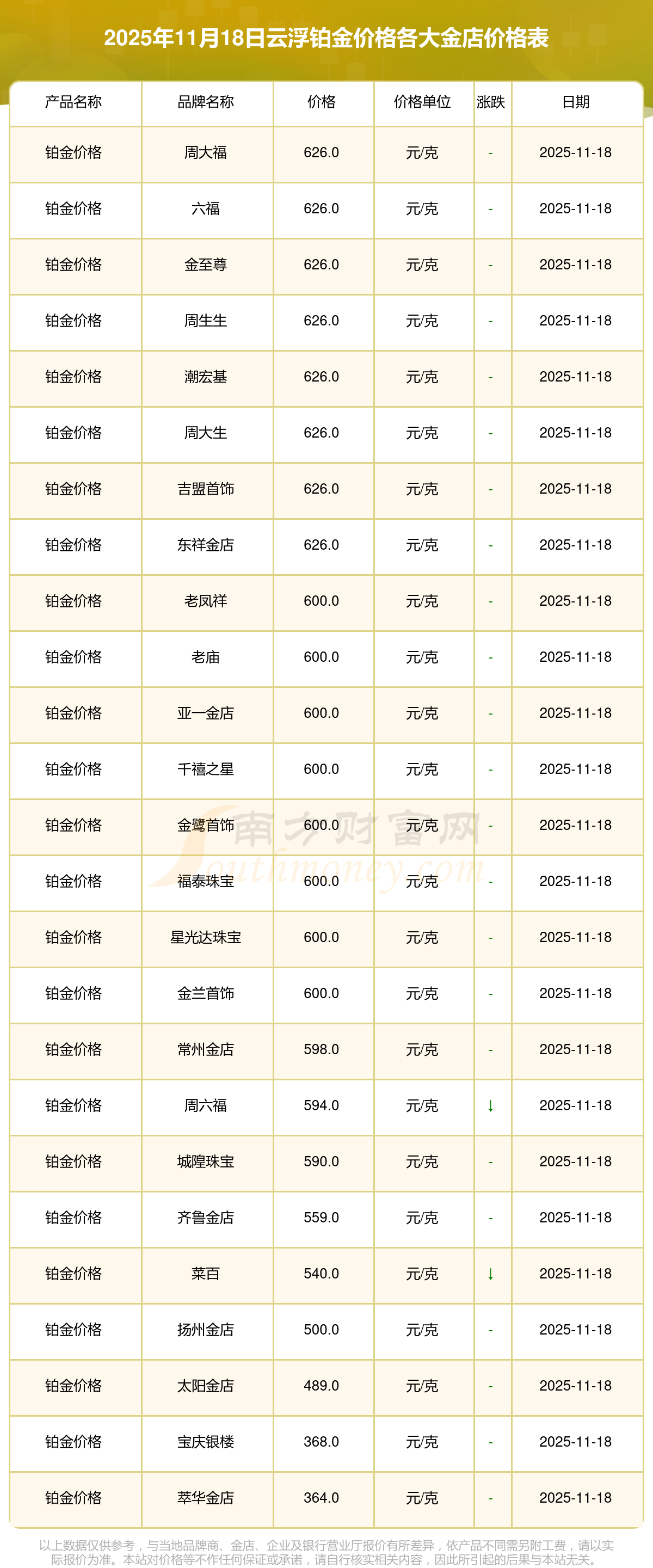 今天是2025年11月18日,云浮周大福、周大福、周大福、周大福、周大福、周大福、周大福、老凤祥、老凤祥、老凤祥、周六福等各大金店品牌铂金价格最新价格行情是这样的:周大福1288.0元/克、周大福626.0元/克、周大福1288.0元/克、周大福44770.0、周大福17820.0、周大福40390.0、周大福1127.0元/克、老凤祥1285.0元/克、老凤祥600.0元/克、老凤祥1285.0元/克、周六福1257.0元/克。