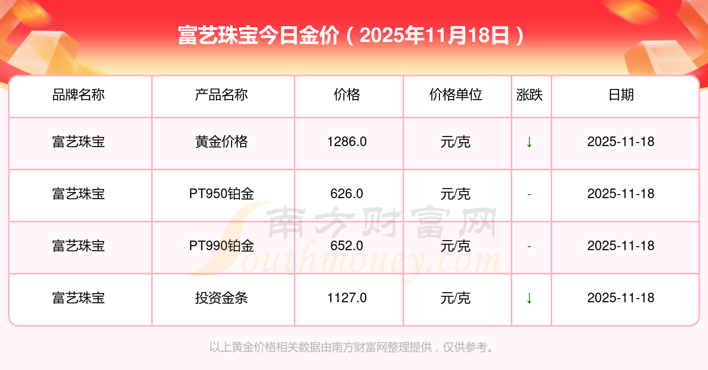 富艺珠宝今日黄金价格行情如何:黄金价格1288.0元/克,铂金价格626.0元/克,饰品金价(内地)1288.0元/克,黄金饰品(香港)44770.0,铂金价格(香港)17820.0,金条价格(香港)40390.0,金条金价(内地)1127.0元/克,黄金价格1285.0元/克,铂金价格600.0元/克,足金价格1285.0元/克,黄金价格1257.0元/克。
