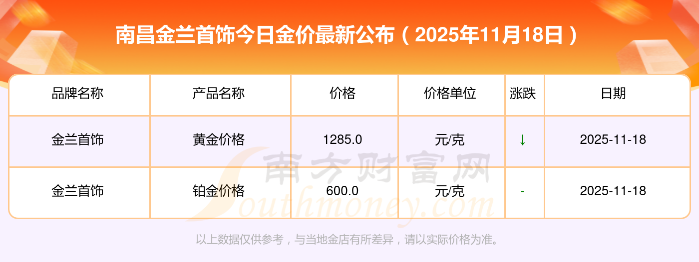 2025年11月18日南昌金兰首饰现在黄金一克要多少钱:黄金价格1288.0元/克,铂金价格626.0元/克,饰品金价(内地)1288.0元/克,黄金饰品(香港)44770.0,铂金价格(香港)17820.0,金条价格(香港)40390.0,金条金价(内地)1127.0元/克,黄金价格1285.0元/克,铂金价格600.0元/克,足金价格1285.0元/克,黄金价格1257.0元/克。