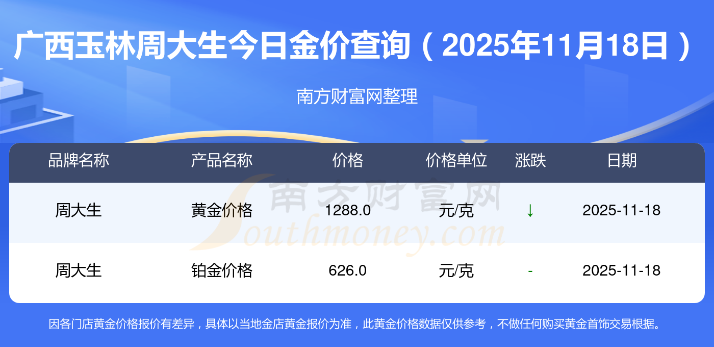 今日黄金价格查询_现在金价黄金一克多少钱,黄金价格是多少钱一克?2025年11月18日广西玉林周大生金价查询:黄金价格1288.0元/克,铂金价格626.0元/克,饰品金价(内地)1288.0元/克,黄金饰品(香港)44770.0,铂金价格(香港)17820.0,金条价格(香港)40390.0,金条金价(内地)1127.0元/克,黄金价格1285.0元/克,铂金价格600.0元/克,足金价格1285.0元/克,黄金价格1257.0元/克。