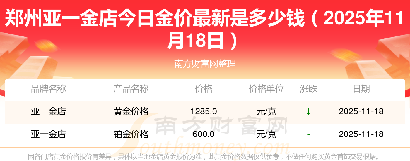 2025年11月18日郑州亚一金店最新价格:黄金价格1288.0元/克,铂金价格626.0元/克,饰品金价(内地)1288.0元/克,黄金饰品(香港)44770.0,铂金价格(香港)17820.0,金条价格(香港)40390.0,金条金价(内地)1127.0元/克,黄金价格1285.0元/克,铂金价格600.0元/克,足金价格1285.0元/克,黄金价格1257.0元/克。