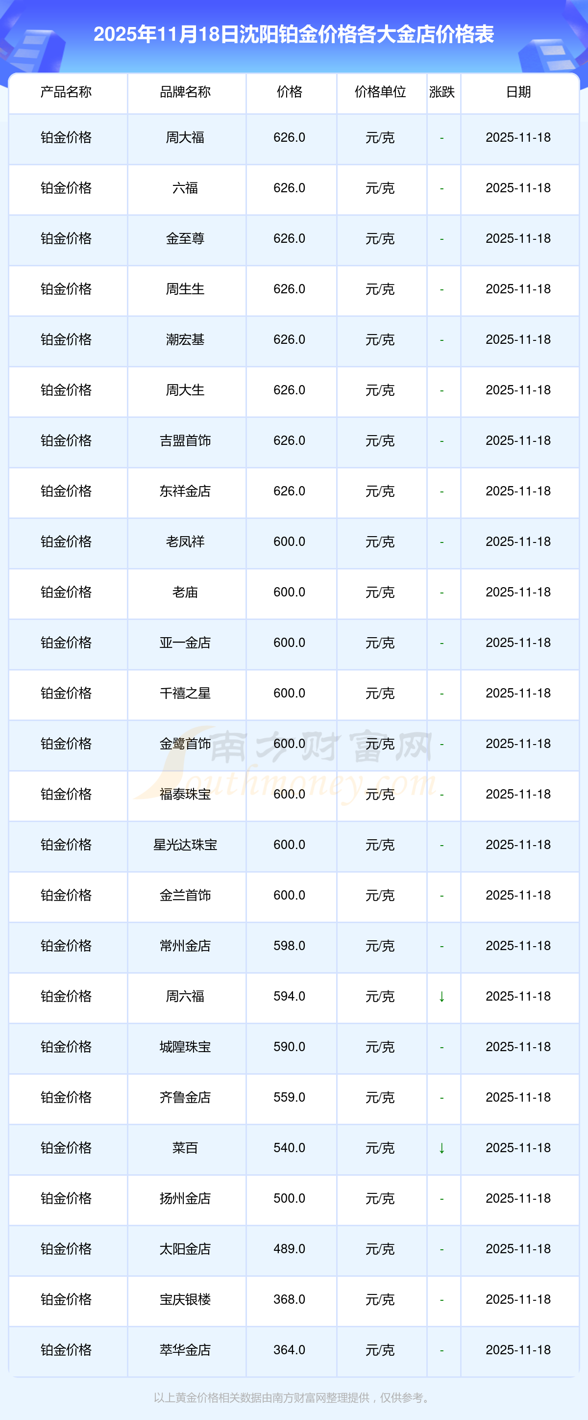 一、沈阳各大金店铂金价格表,2025年11月18日沈阳各大金店铂金价格多少钱一克?
