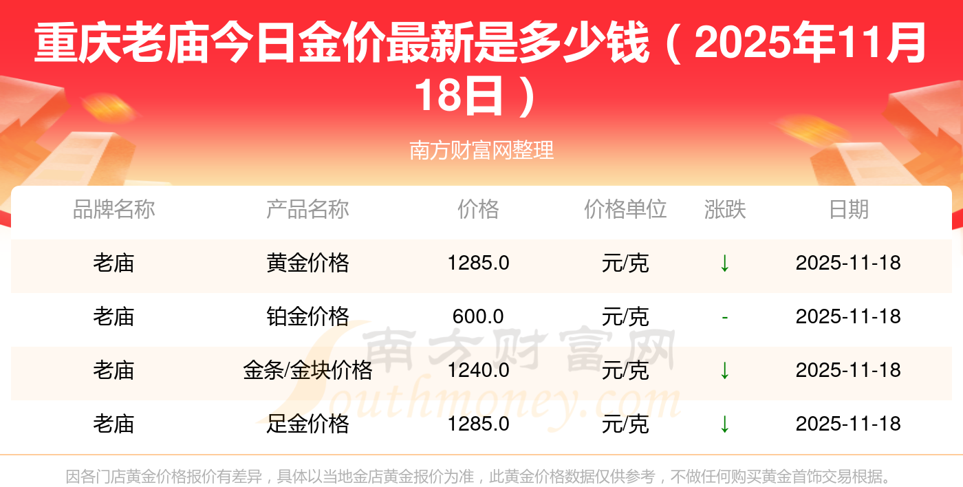 今天黄金价格行情怎样?此刻每克黄金售价多少?2025年11月18日重庆老庙一克黄金的售价是多少:黄金价格1288.0元/克,铂金价格626.0元/克,饰品金价(内地)1288.0元/克,黄金饰品(香港)44770.0,铂金价格(香港)17820.0,金条价格(香港)40390.0,金条金价(内地)1127.0元/克,黄金价格1285.0元/克,铂金价格600.0元/克,足金价格1285.0元/克,黄金价格1257.0元/克。