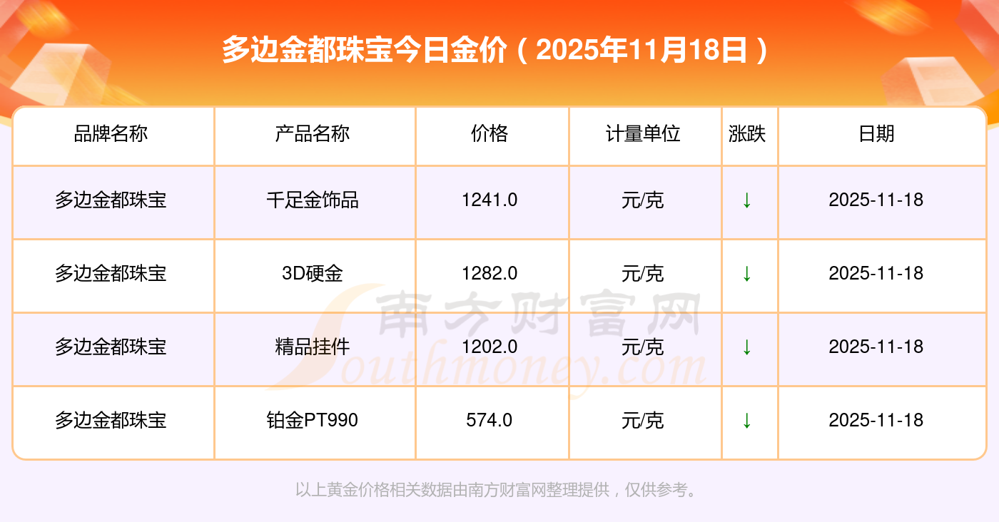 2025年11月18日多边金都珠宝今日价格:黄金价格1288.0元/克,铂金价格626.0元/克,饰品金价(内地)1288.0元/克,黄金饰品(香港)44770.0,铂金价格(香港)17820.0,金条价格(香港)40390.0,金条金价(内地)1127.0元/克,黄金价格1285.0元/克,铂金价格600.0元/克,足金价格1285.0元/克,黄金价格1257.0元/克。