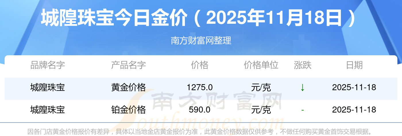 今天是2025年11月18日,周大福、周大福、周大福、周大福、周大福、周大福、周大福、老凤祥、老凤祥、老凤祥、周六福等各大金店品牌黄金价格最新价格如下:周大福1288.0元/克、周大福626.0元/克、周大福1288.0元/克、周大福44770.0、周大福17820.0、周大福40390.0、周大福1127.0元/克、老凤祥1285.0元/克、老凤祥600.0元/克、老凤祥1285.0元/克、周六福1257.0元/克。