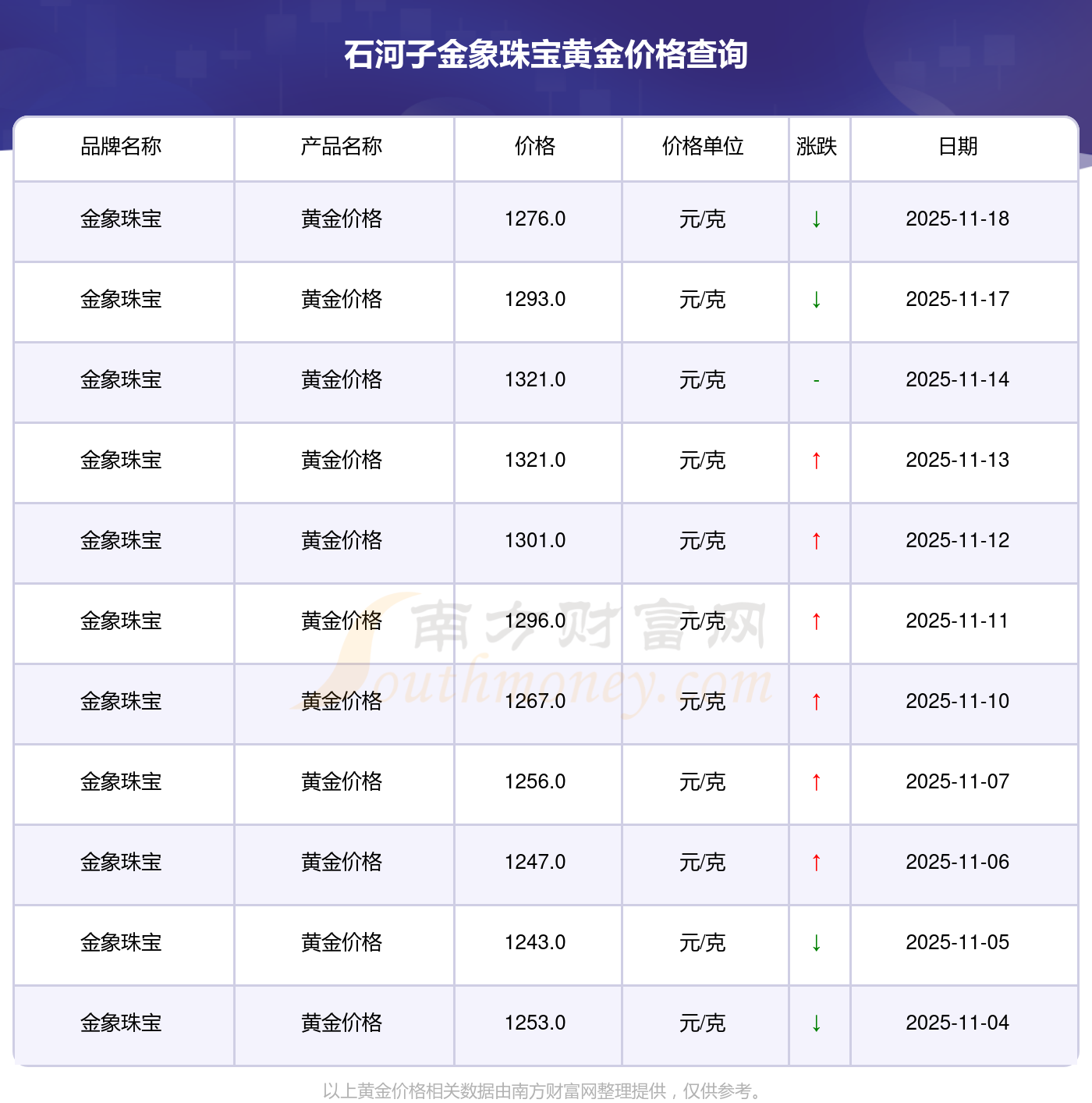 2025年11月18日,周大福、周大福、周大福、周大福、周大福、周大福、周大福、老凤祥、老凤祥、老凤祥、周六福等各大金店品牌黄金价格今日价格如下:周大福1288.0元/克、周大福626.0元/克、周大福1288.0元/克、周大福44770.0、周大福17820.0、周大福40390.0、周大福1127.0元/克、老凤祥1285.0元/克、老凤祥600.0元/克、老凤祥1285.0元/克、周六福1257.0元/克。