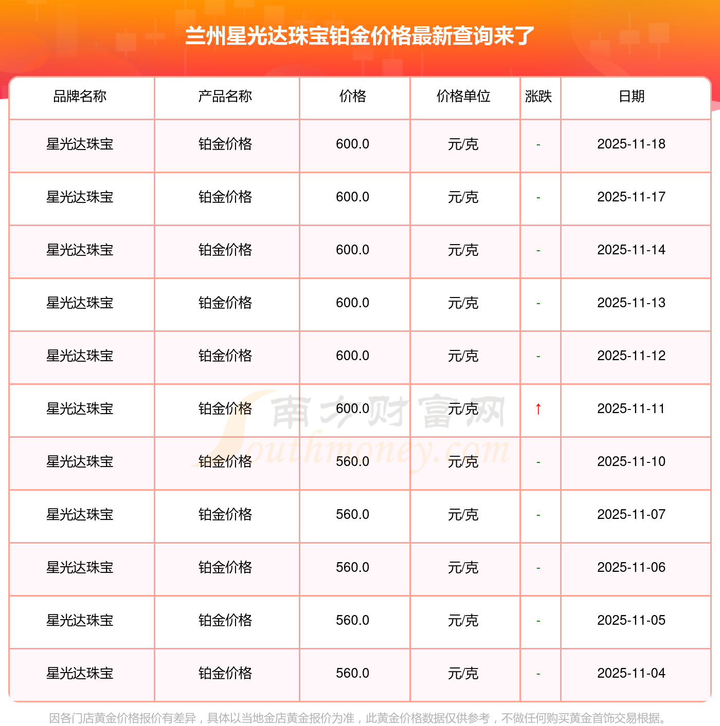 兰州星光达珠宝的铂金价格在今日(2025年11月18日),每克售价为600.0元/克。