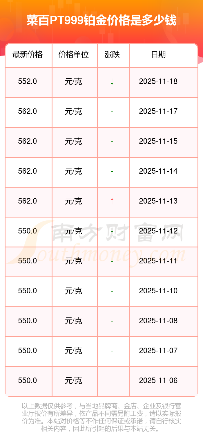 2025年11月18日菜百PT999铂金价格为552.0元/克。