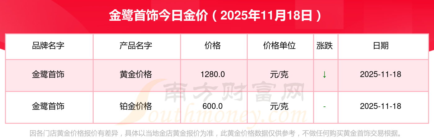2025年11月18日金鹭首饰最新价格:黄金价格1288.0元/克,铂金价格626.0元/克,饰品金价(内地)1288.0元/克,黄金饰品(香港)44770.0,铂金价格(香港)17820.0,金条价格(香港)40390.0,金条金价(内地)1127.0元/克,黄金价格1285.0元/克,铂金价格600.0元/克,足金价格1285.0元/克,黄金价格1257.0元/克。