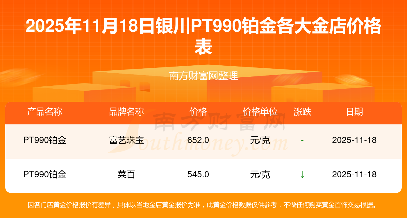 今日银川PT990铂金最低的金店是菜百,报价545.0元/克,最高的是富艺珠宝,报价652.0元/克。今日PT990铂金高低差为107元/克。