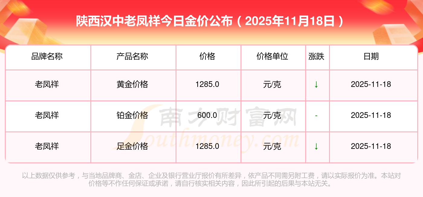 2025年11月18日陕西汉中老凤祥黄金按克计价,现在多少钱一克?黄金价格1288.0元/克,铂金价格626.0元/克,饰品金价(内地)1288.0元/克,黄金饰品(香港)44770.0,铂金价格(香港)17820.0,金条价格(香港)40390.0,金条金价(内地)1127.0元/克,黄金价格1285.0元/克,铂金价格600.0元/克,足金价格1285.0元/克,黄金价格1257.0元/克。