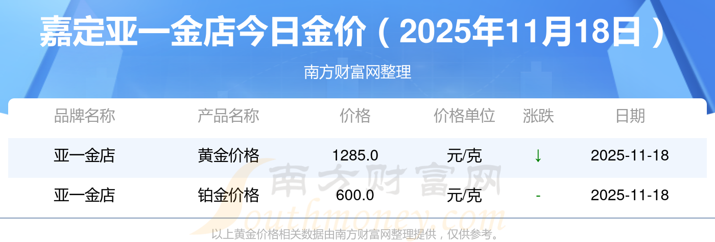 2025年11月18日嘉定亚一金店黄金的单价,一克为多少?黄金价格1288.0元/克,铂金价格626.0元/克,饰品金价(内地)1288.0元/克,黄金饰品(香港)44770.0,铂金价格(香港)17820.0,金条价格(香港)40390.0,金条金价(内地)1127.0元/克,黄金价格1285.0元/克,铂金价格600.0元/克,足金价格1285.0元/克,黄金价格1257.0元/克。