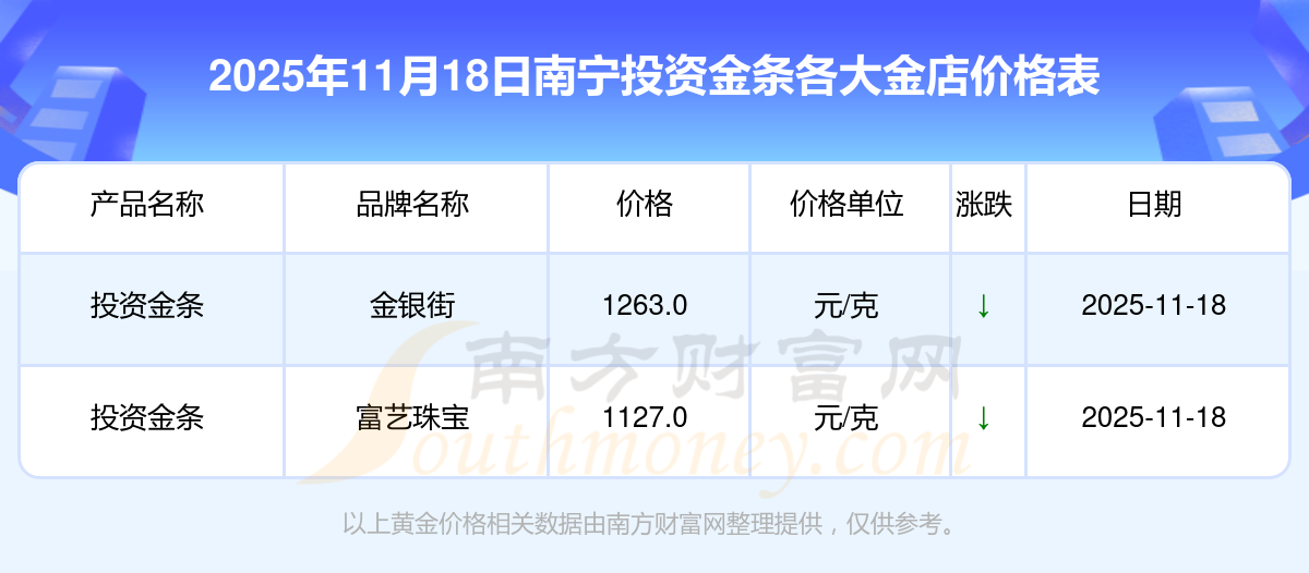 2025年11月18日南宁周大福、周大福、周大福、周大福、周大福、周大福、周大福、老凤祥、老凤祥、老凤祥、周六福等各大金店品牌投资金条最新价格如下:周大福黄金价格1288.0元/克,周大福铂金价格626.0元/克,周大福饰品金价(内地)1288.0元/克,周大福黄金饰品(香港)44770.0,周大福铂金价格(香港)17820.0,周大福金条价格(香港)40390.0,周大福金条金价(内地)1127.0元/克,老凤祥黄金价格1285.0元/克,老凤祥铂金价格600.0元/克,老凤祥足金价格1285.0元/克,周六福黄金价格1257.0元/克。
