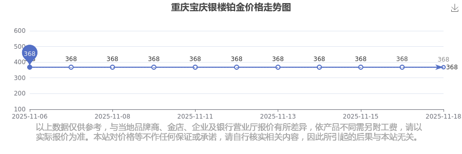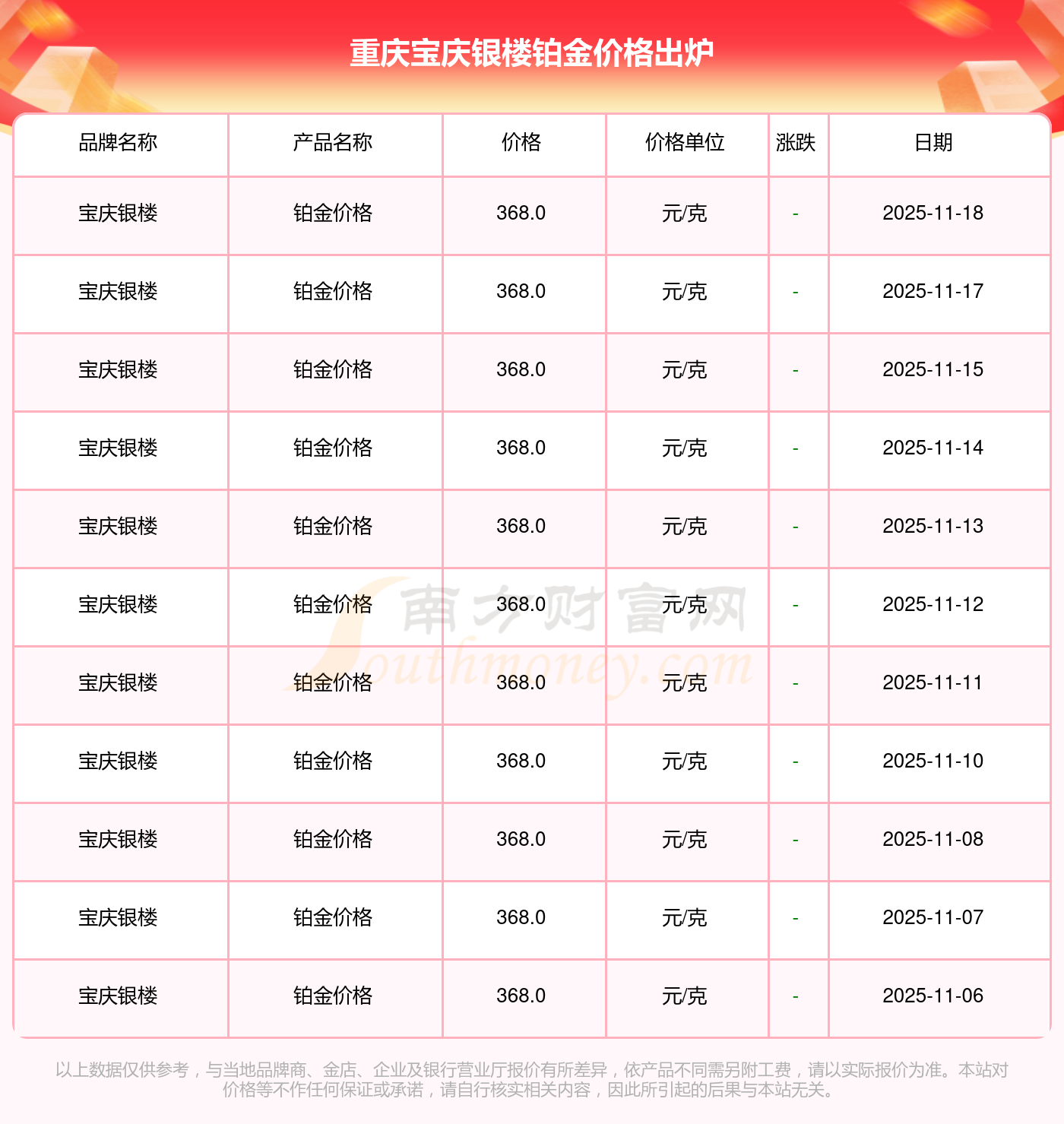 今日2025年11月18日,重庆宝庆银楼铂金价格为368.0元/克。