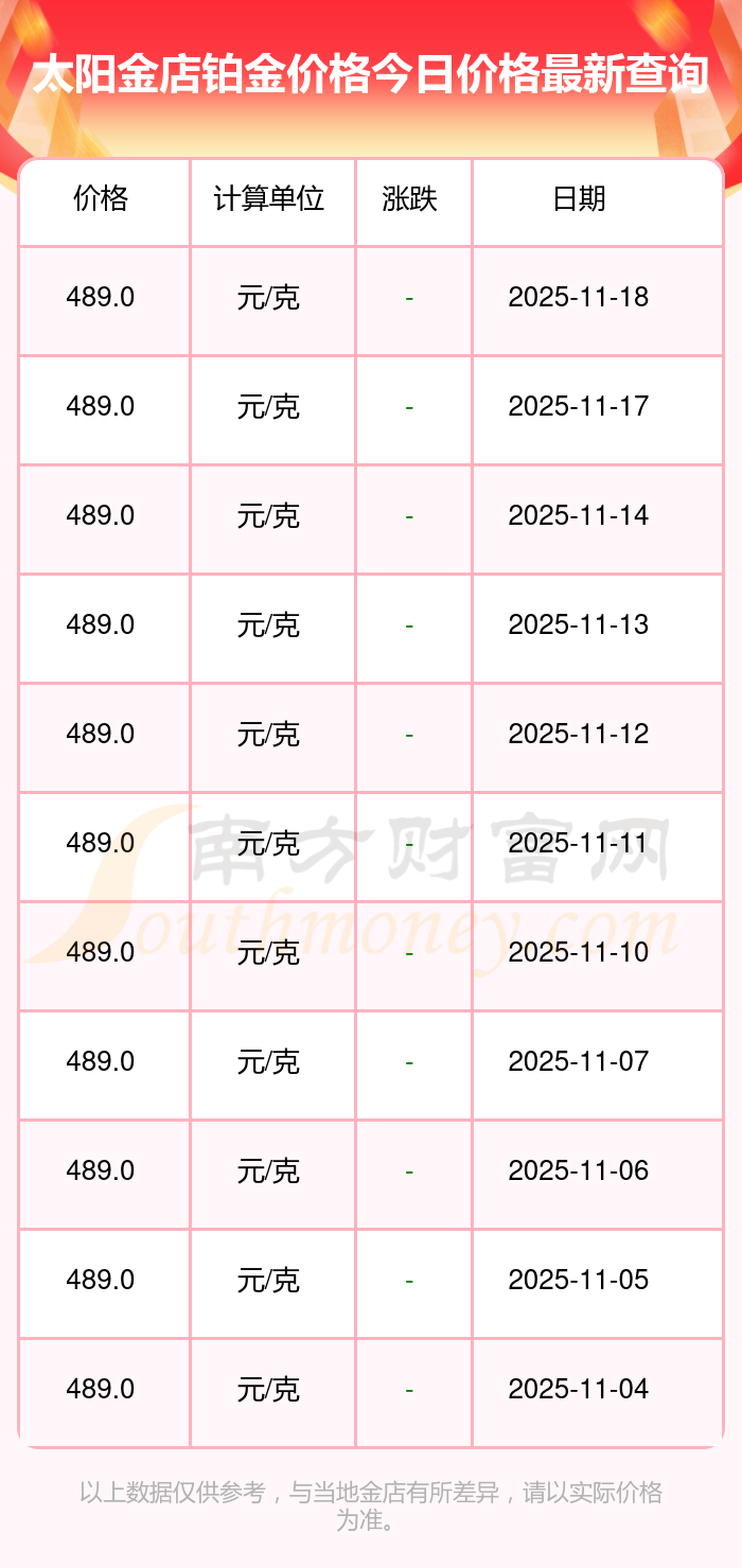 2025年11月18日太阳金店铂金价格:489.0元/克。