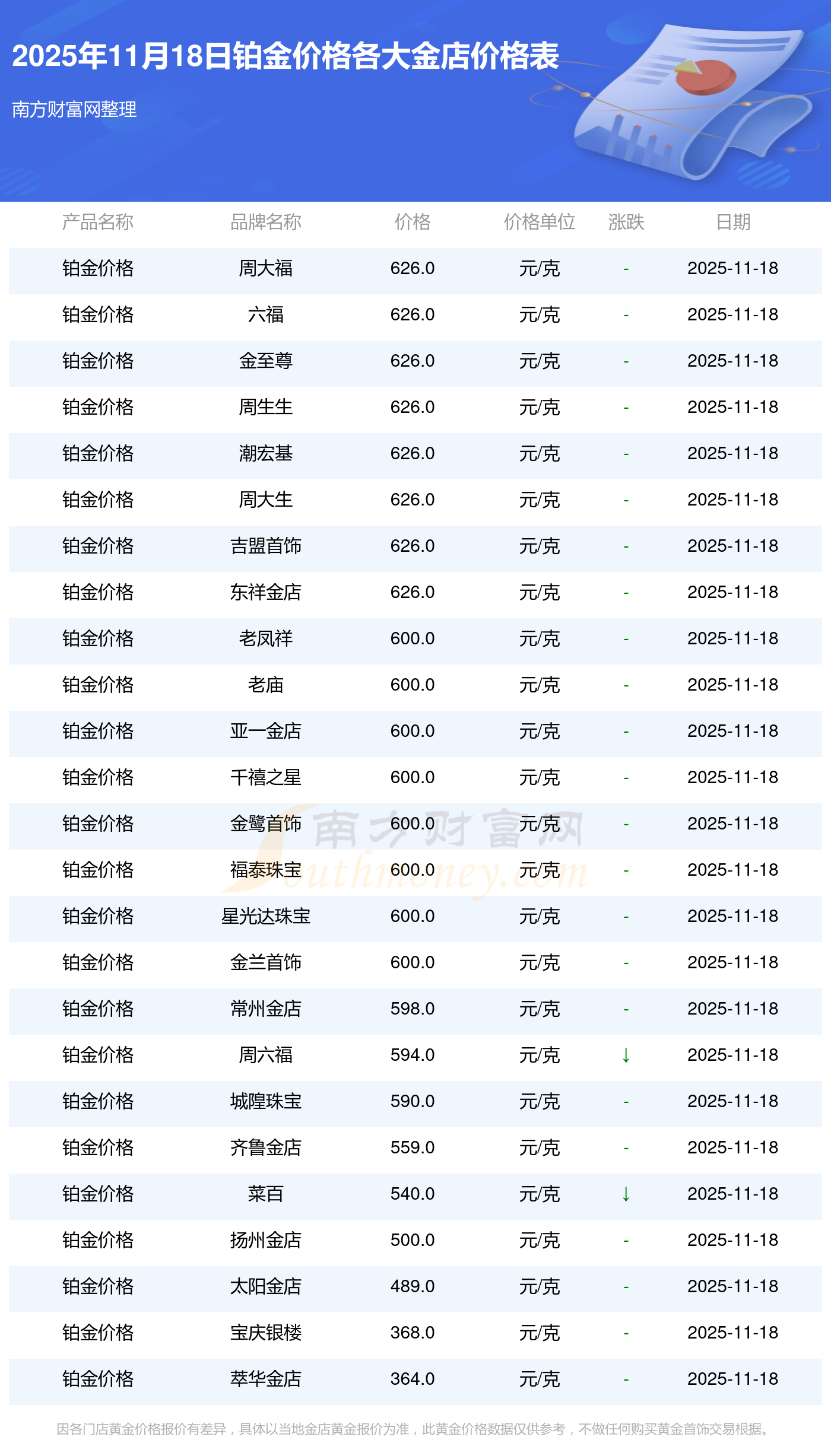 2025年11月18日周大福、周大福、周大福、周大福、周大福、周大福、周大福、老凤祥、老凤祥、老凤祥、周六福等各大金店品牌铂金价格最新价格如下:周大福黄金价格1288.0元/克,周大福铂金价格626.0元/克,周大福饰品金价(内地)1288.0元/克,周大福黄金饰品(香港)44770.0,周大福铂金价格(香港)17820.0,周大福金条价格(香港)40390.0,周大福金条金价(内地)1127.0元/克,老凤祥黄金价格1285.0元/克,老凤祥铂金价格600.0元/克,老凤祥足金价格1285.0元/克,周六福黄金价格1257.0元/克。