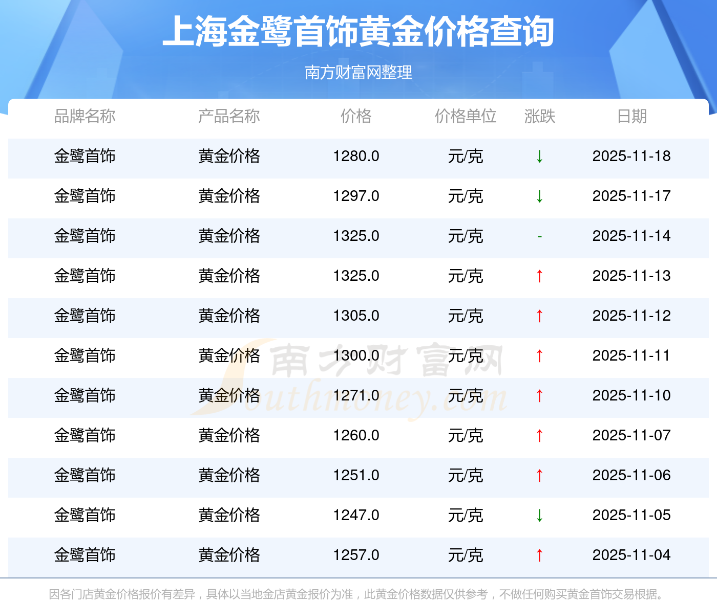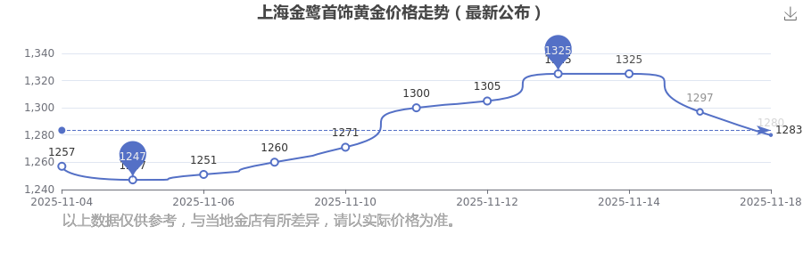 2025年11月18日上海金鹭首饰黄金价格是1280.0元/克。