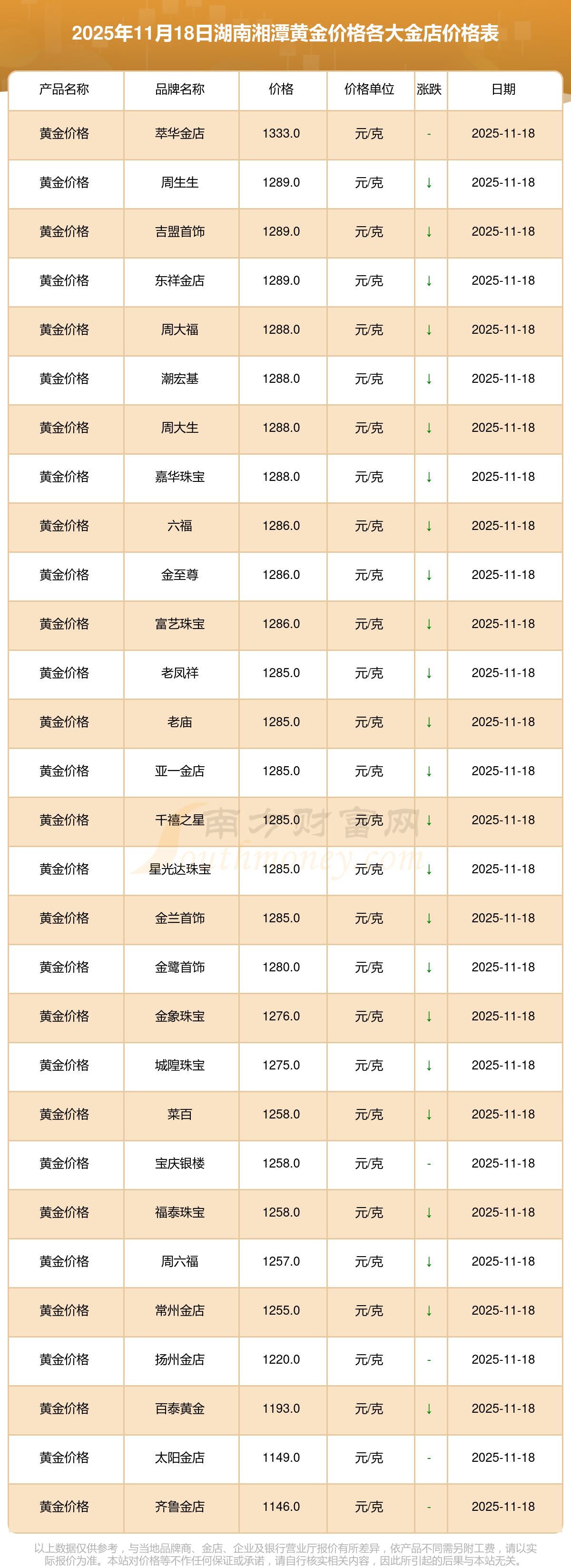 2025年11月18日湖南湘潭各大金店黄金价格最新价格查询来了:周大福1288.0元/克,周大福626.0元/克,周大福1288.0元/克,周大福44770.0,周大福17820.0,周大福40390.0,周大福1127.0元/克,老凤祥1285.0元/克,老凤祥600.0元/克,老凤祥1285.0元/克,周六福1257.0元/克。