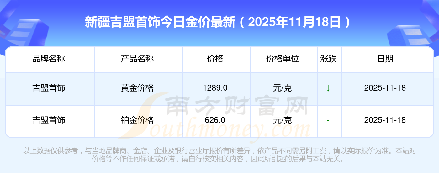 想了解今日黄金价格,现在每克黄金的价格是多少呢?2025年11月18日新疆吉盟首饰现在购买一克黄金需要支付多少钱?黄金价格1288.0元/克,铂金价格626.0元/克,饰品金价(内地)1288.0元/克,黄金饰品(香港)44770.0,铂金价格(香港)17820.0,金条价格(香港)40390.0,金条金价(内地)1127.0元/克,黄金价格1285.0元/克,铂金价格600.0元/克,足金价格1285.0元/克,黄金价格1257.0元/克。