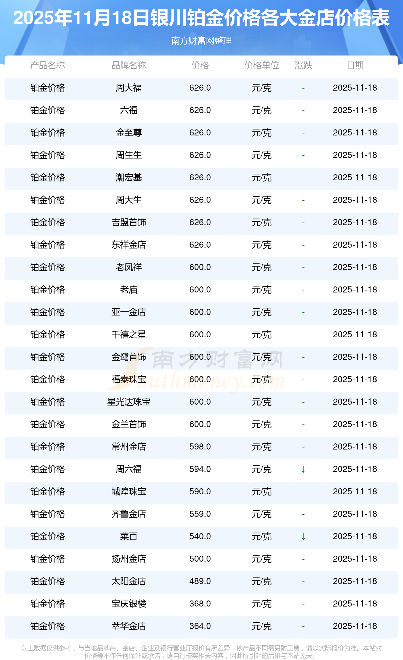以上数据仅供参考,与当地品牌商、金店、企业及银行营业厅报价有所差异,依产品不同需另附工费,请以实际报价为准。本站对价格等不作任何保证或承诺,请自行核实相关内容,因此所引起的后果与本站无关。