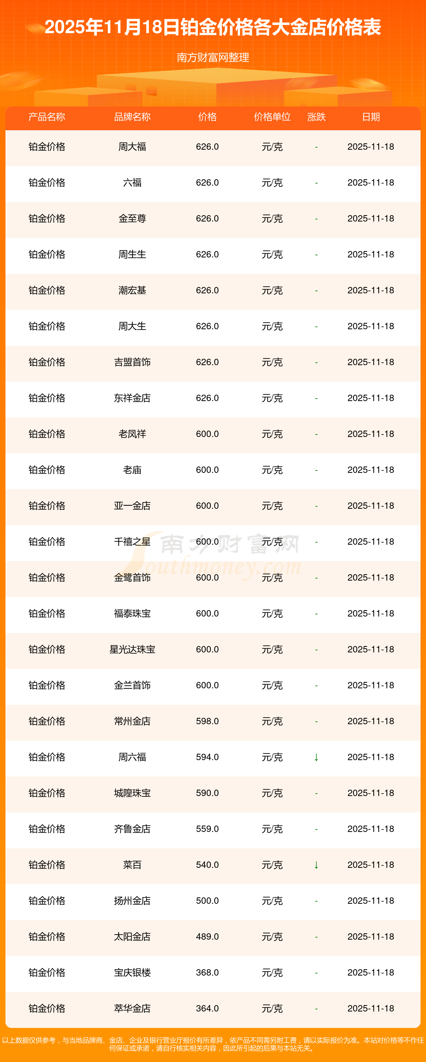 2025年11月18日,周大福、周大福、周大福、周大福、周大福、周大福、周大福、老凤祥、老凤祥、老凤祥、周六福等各大金店品牌铂金价格今日价格如下:周大福1288.0元/克、周大福626.0元/克、周大福1288.0元/克、周大福44770.0、周大福17820.0、周大福40390.0、周大福1127.0元/克、老凤祥1285.0元/克、老凤祥600.0元/克、老凤祥1285.0元/克、周六福1257.0元/克。